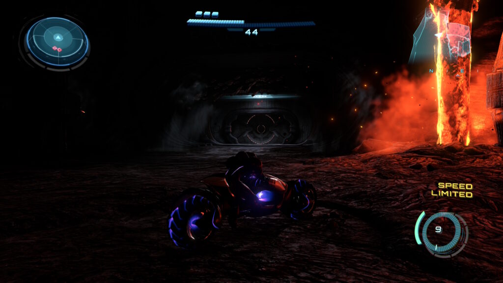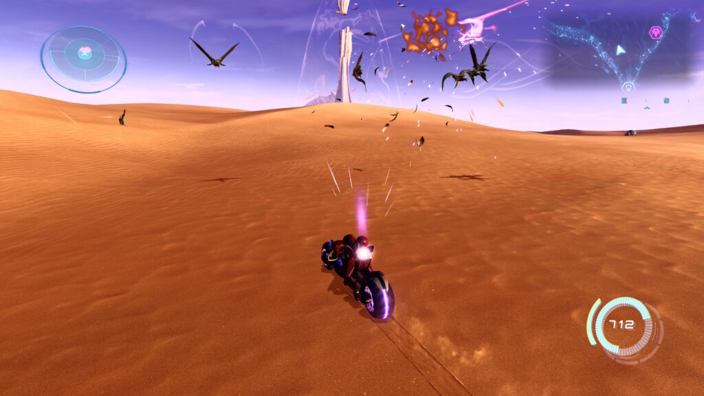 Tegevuspaikade läbimine käib nimelt rangelt paika pandud rada pidi. Jah, te võite motikaga sõita ükskõik millise tegevuspaiga juurde (üllatus-üllatus, need asuvad kaardi neljas erinevas nurgas), kuid ühte sisenedes ootab teid ees sein ja teise sisenedes langeb alla sild. See tähendab, et edenemiseks on teil vaja kindlat tüüpi elemendilasku ja teekonnal kuidagi lõigata ei anna. Nii asutegi risti-põiki motikaga kõrbes ringi sõitma. Esmalt suts ühte tegevuspaika, paar laadimisekraani, võtate sealt ühe kiibi, siis tagasi välja, sest edasi ju ei saa, vidinaga tagasi metsa Mylesi juurde, kes relva ära tuunib, siis uue lasuga teises tegevuspaigas tee lahti teha, uus kiip korjata, uuesti metsa naasta, relva tuunida ja… See kõik on kohutavalt tüütu. Palun laske mul vähemalt metsa kiirreisida, ma tõesti ei taha motikaga kõrbes jaurata. Tegelikult tuleks ära mainida, et kõrbes jauramine on kohustuslik, sest sealt peab koguma rohelisi kristalle, mis on vajalikud nii mängu elementide parendamiseks kui ka “päris” lõpustseeni nägemiseks.