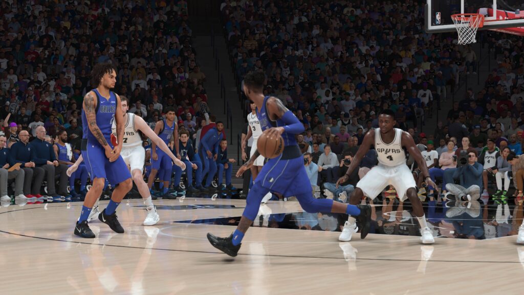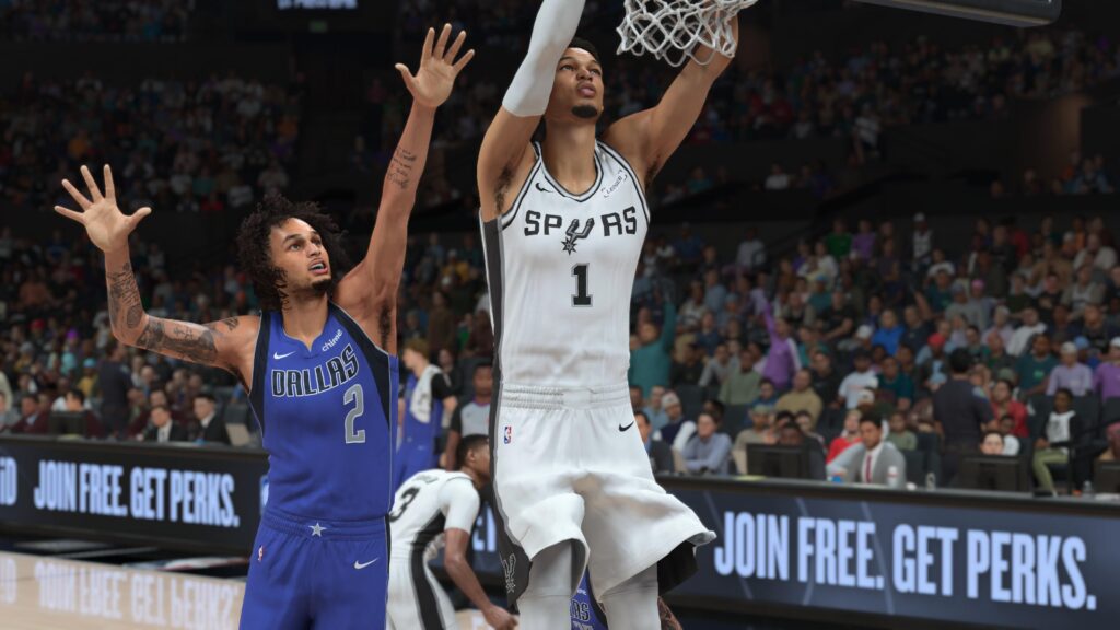 Probleem tekib aga sellest, et MyPlayeri ehitamiseks on optimaalne viis ja mängimiseks optimaalne stiil. Kuna ideaalse lahtilaskmise punkti paneb paika see, kui vaba sa oled ja kuna kaitse on sel aastal täiesti kasutu, siis tuleb ehitada Wembanyama pikkune koljat hästi pikkade kätega, kellele tuleb anda hästi kiired liikumisanimatsioonid ning liikumise pealt tahakaldega viskeid teele saata. Neid ei kaitse keegi, seega ideaalne viskamispunkt on hiigelsuur ja visked tabavad 60-70% täpsusega. Korvpalli üks raskemaid viskeid on “NBA 2K26s” kõige lihtsam ja optimaalsem ning see tähendab, et netimängud taanduvad arutule kolmeste pildumisele. Sama peegeldub ka netis 5VS5 kossu mängides, sest Kevin Durant ja teised temasarnased on ikka tõsiselt tugevad. Asja ei tee paremaks see, et ka pealtpanekuid ja alley-oope tuleb green’ida ja alley-oopi puhul peab selle korvi virutaja vajutama kiirelt ka ekraanile ilmuvat suvaliselt valitavat nuppu. See tähendab, et korvi kohale ei sööda põhimõtteliselt keegi. Kuniks kaitset ei tugevdata või viskamist ei nõrgestata, pole päris kossust hoolivatel isikutel netimängu asja. Kolmesepilduritel on aga pidupäev.